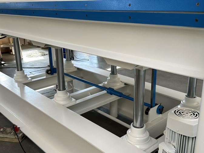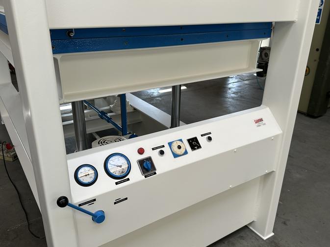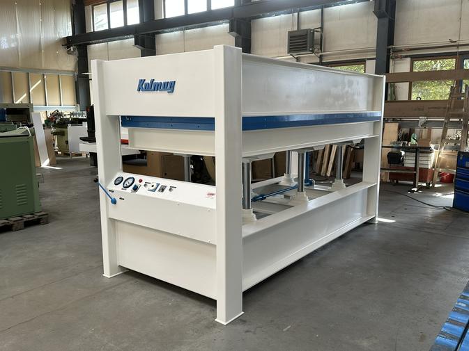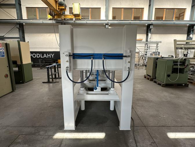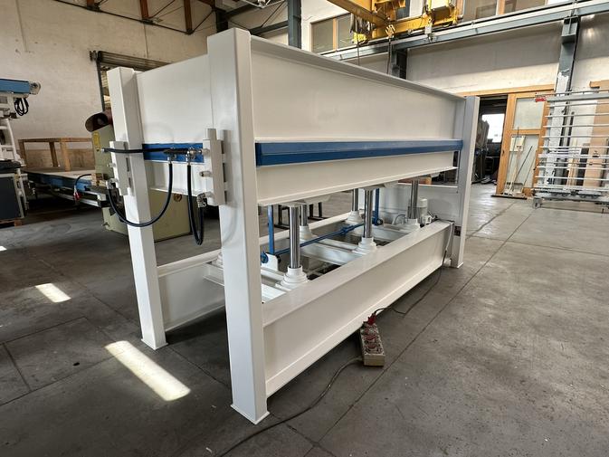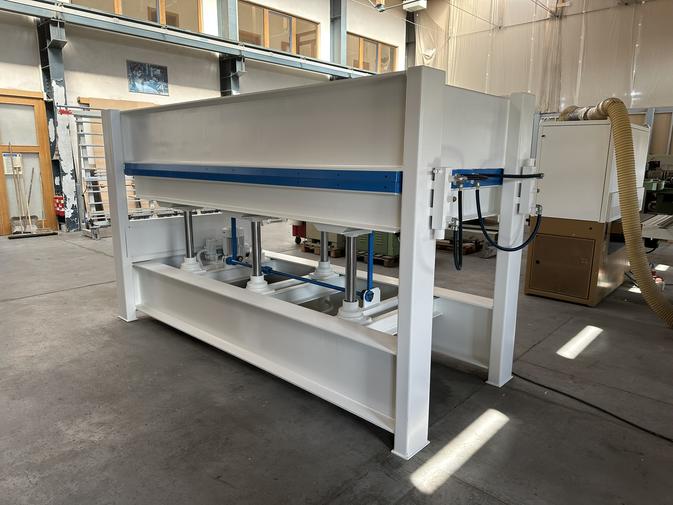 Repasovaný šesti-pístový hydraulický plošný lis italské výroby. Značkový etážový lis na snadné dýhování dřeva.